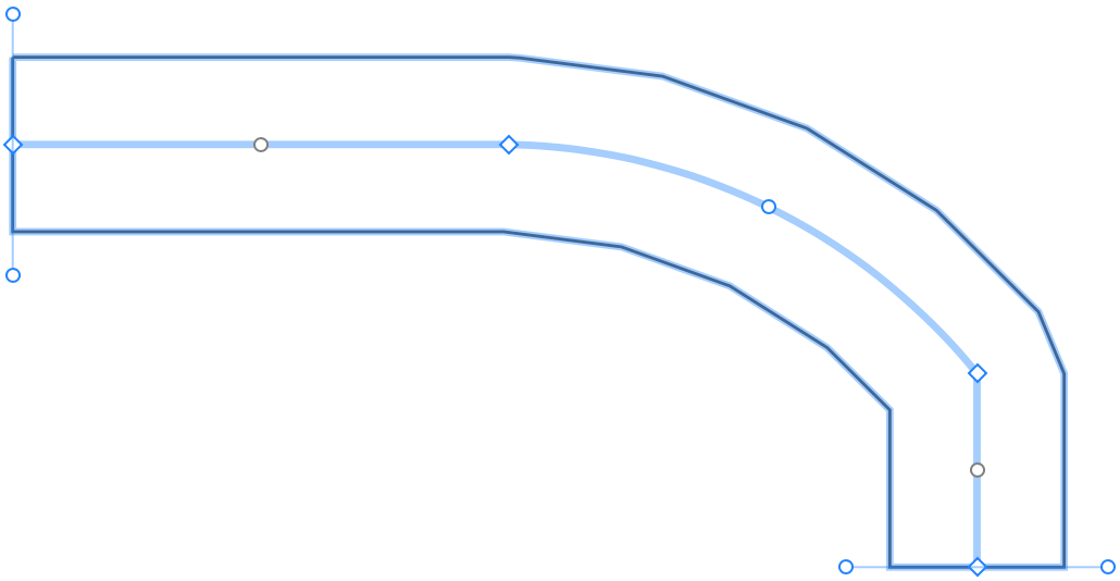 Wenn Sie einen Weg zeichnen, fügen Sie seine Anfangs- und Endpunkte hinzu und – eventuell – einen oder mehrere Zwischenpunkte, um Biegungen zu erstellen. Die Positionen all dieser Punkte legen die Form der Mittellinie fest. Jeder Punkt verfügt über einen rautenförmigen Anfasser. Schließlich führt der erstellte Weg mit einer festgelegten Breite an der Mittellinie entlang.