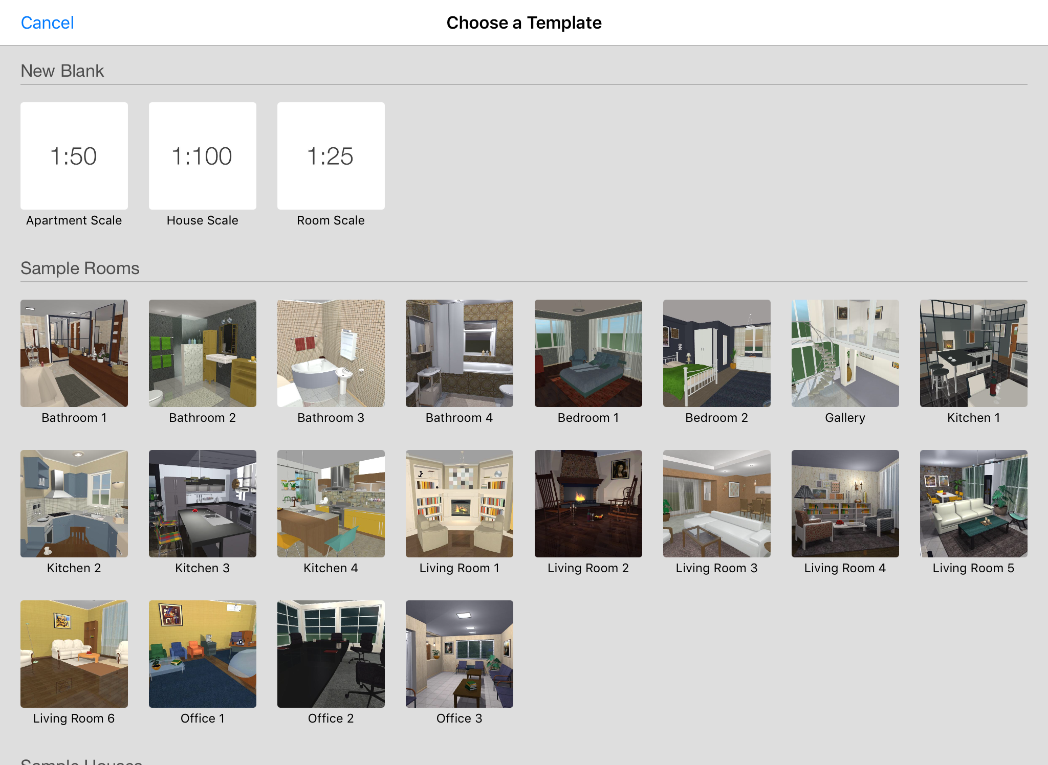 To create a new project, tap on the Create Document item at the top of the list. It opens the Template Gallery.
