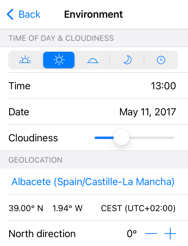 To set up the daylight, open the Light Properties tab of the Inspector and tap on the Environment button.