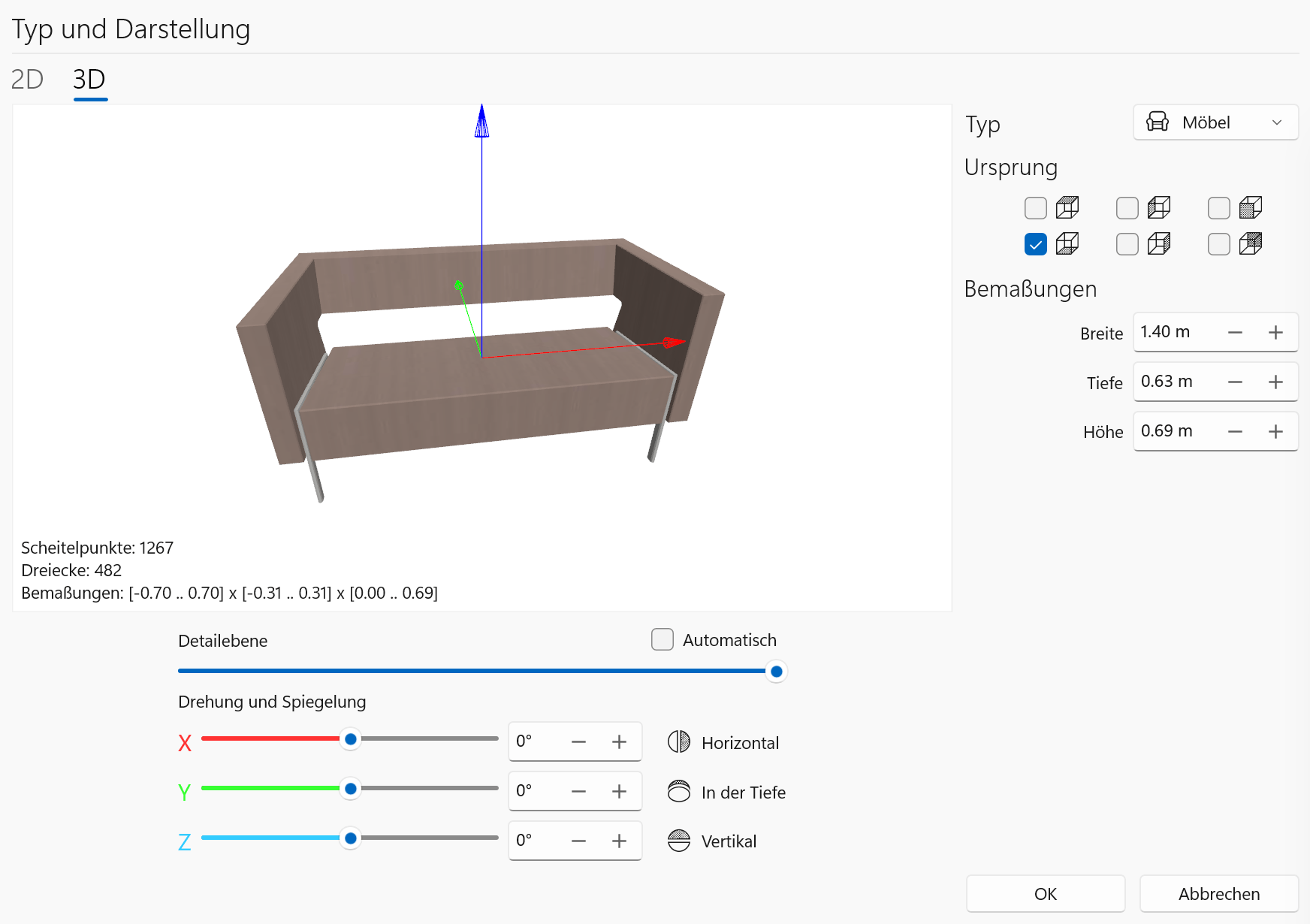 Mit dem Schieberegler für die Detailebene können Sie die Anzahl der Details im 3D-Modell verringern. Die ganz rechte Position des Schiebereglers entspricht dem Originalobjekt. In der Vorschau wird angezeigt, wie das Objekt im Projekt aussehen wird.