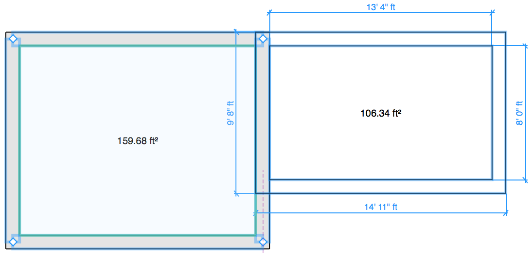 Lassen Sie beim Zeichnen eines angrenzenden Raumes mit dem Werkzeug Raum eine seiner Wände mit einer Wand eines anderen Raumes genau überlagern. Das Programm erstellt automatisch eine Trennwand im überlagerten Bereich.