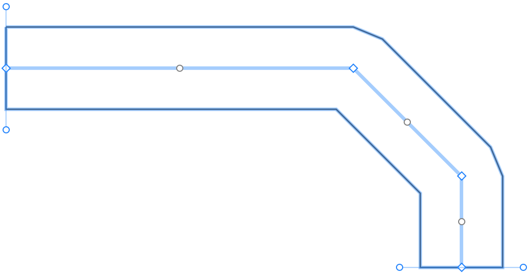 When you draw a pathway, you add its start and end points and, possibly, one or more intermediate points to create turns. The locations of all of these points define the shape of the central line. Each point has a diamond-shaped handle. Finally, the created pathway goes along the central line with a specified width.