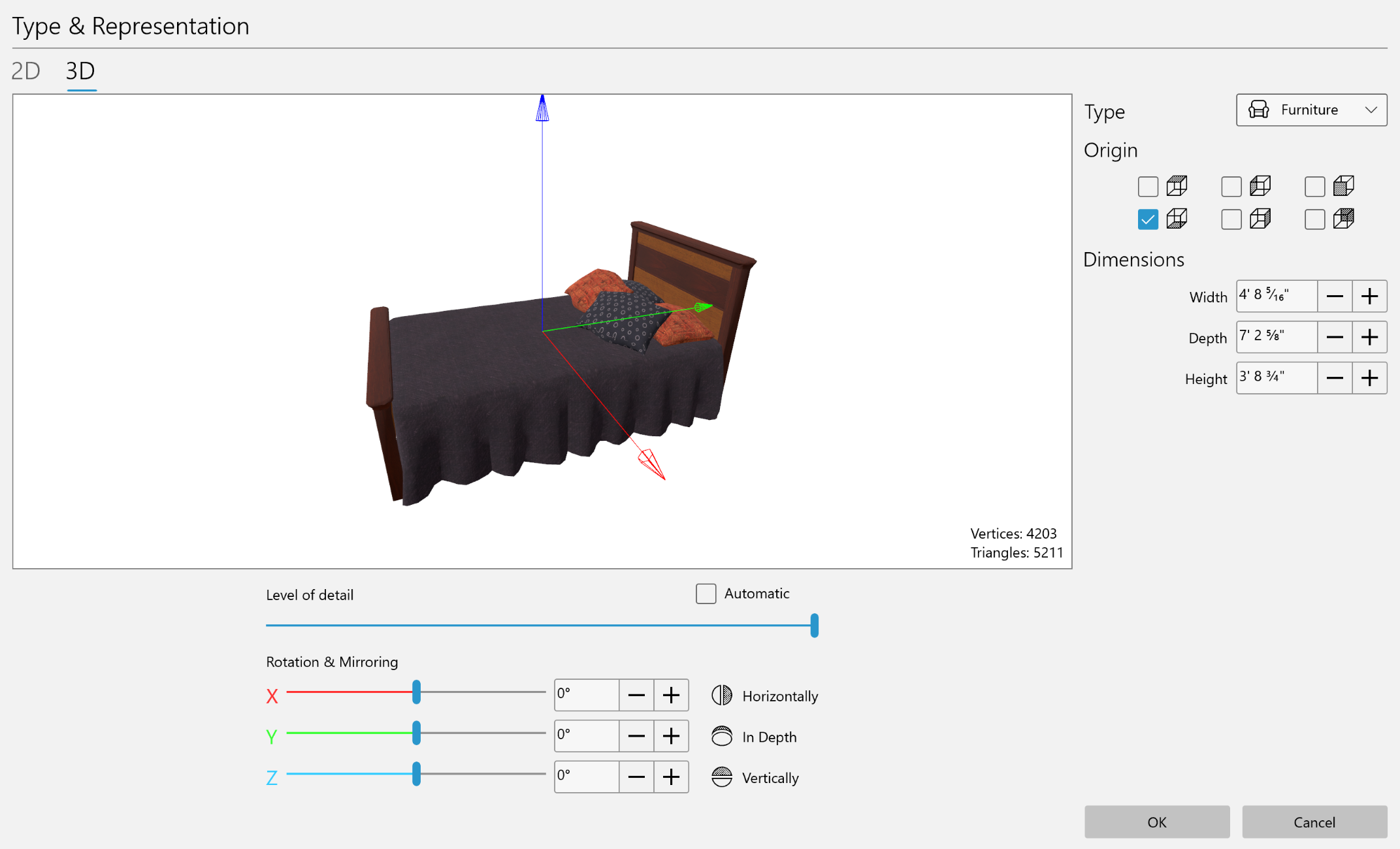The Level of detail slide bar lets you decrease the amount of details in the 3D model. The far right position of the slider corresponds to the original object. The preview shows how the object will look in the project.