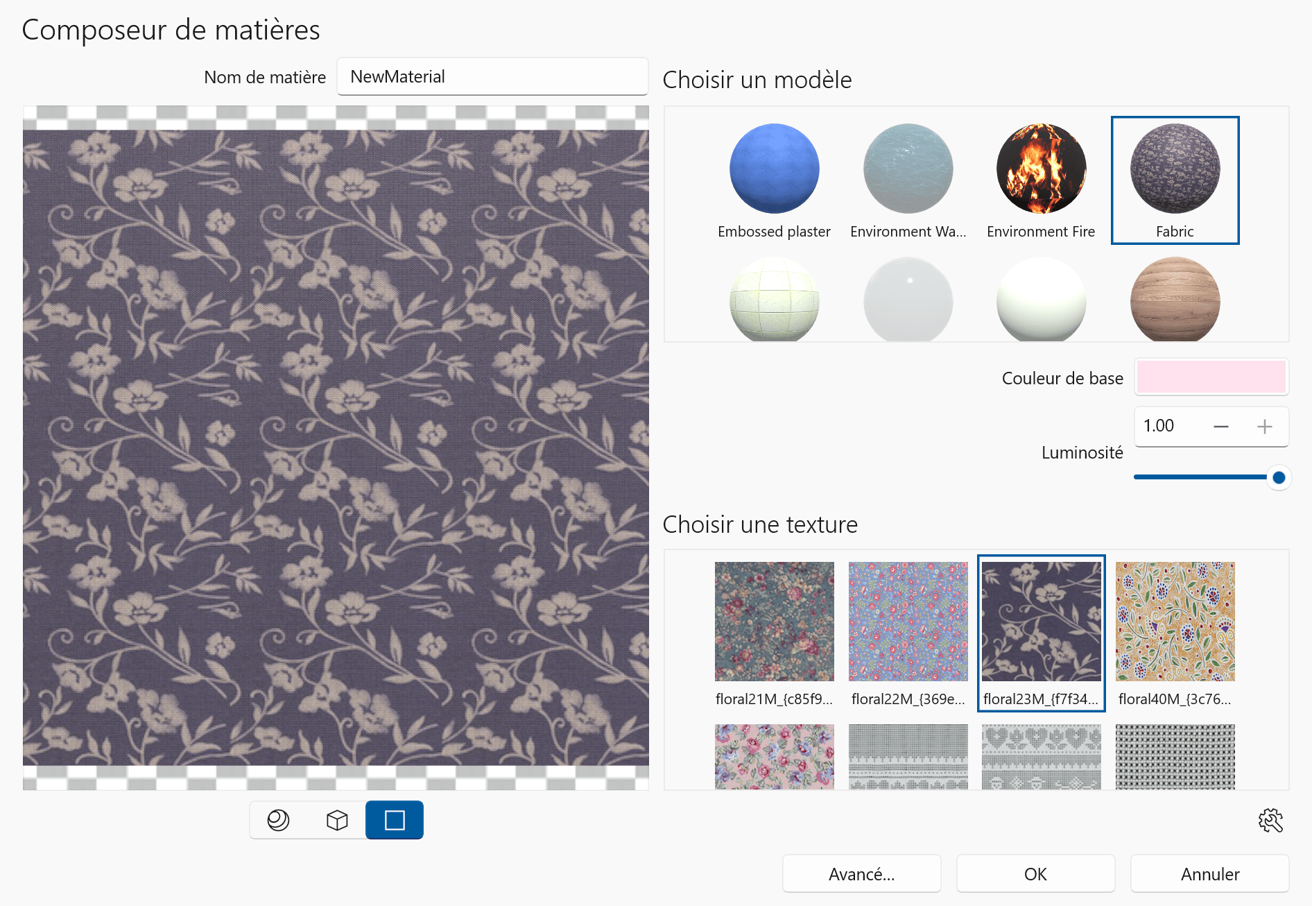 Pour régler vous-même tous les paramètres disponibles au lieu d’utiliser des modèles, cliquez sur le bouton Avancé… pour ouvrir l’éditeur de matières. (Édition Pro uniquement)